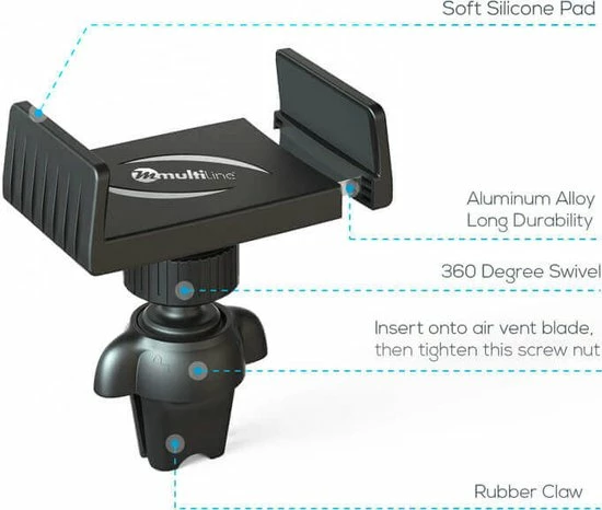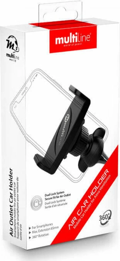 Wil je een sterke telefoonhouder voor in de auto? Deze telefoonhouder van Multiline gaat in de ventilatierooster van je auto. Je kunt dan heel makkelijk de navigatie op je telefoon gebruiken. De breedte hiervan is universeel en kan aangepast worden aan de grootte van je telefoon. De telefoon kun je makkelijk bedienen door deze telefoonhouder. Verder is deze telefoonhouder geschikt voor alle telefoons.