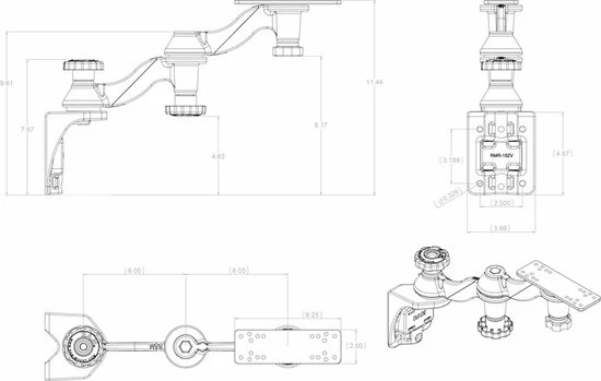 De RAM dubbele zwenkarmbevestiging omvat twee 6″ lange BENT zwenkarmen die op een verticale montagebasis zijn gemonteerd. Aan het einde van de apparaatmontage bevindt zich een rechthoekige 6,25 x 2″ bovenbasis. De draaipunten van de houder maken een volledige rotatie van 360 graden mogelijk.