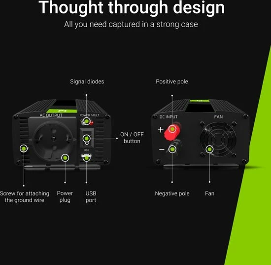 De Green Cell 300W/600W zuivere sinusomvormer Inverter 24V naar 230V omvormer wordt gebruikt om uw elektrische apparaten altijd en overal op te laden. Het bevat ook een USB-poort om kleinere apparaten zoals smartphones en tablets op te laden. Hij heeft stopcontacten om de elektrische apparaten veilig en snel aan te sluiten en op te laden. Daarnaast beschikt het over een zuivere sinusgolf die perfect werkt met apparaten die continu stroom nodig hebben, zoals bouwmachines, zonne-energiesystemen, warmtepompen en verwarmingen. Het is de beste oplossing als u niet in de buurt van de stroombron bent. U hoeft zich geen zorgen te maken over overspanning, want de omvormer is uitgerust met veiligheidsvoorzieningen en veiligheidscertificaten voor een soepele werking. Het bevat ook een intelligente ventilator om de temperatuur milder te houden. Op dit product zit 24 maanden garantie met een retourbeleid van 30 dagen.