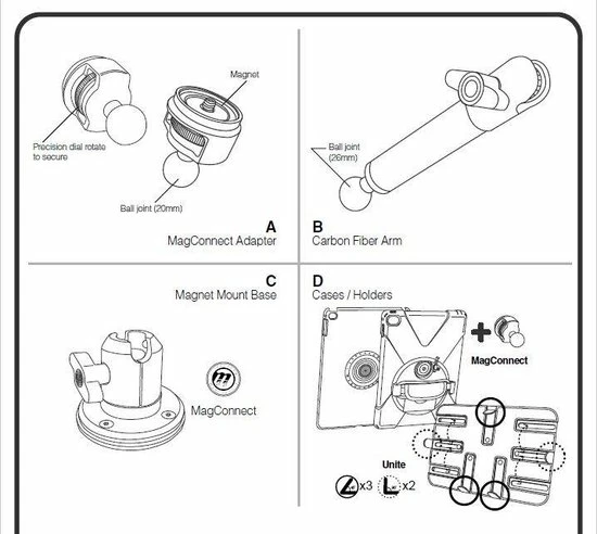 MagConnect ™ mounts zijn uitgerust met bolvormige koppelingen voor ultieme aanpasbaarheid. De meegeleverde MagConnect ™ iPad houder kan 360 ° worden gedraaid om gemakkelijk de overgang van portret naar landscape modus te maken zonder de mount te verwijderen. En de stevige carbon armen kunnen daarom worden aangepast in oneindige configuraties zodat u de perfecte hoek kunt vinden.