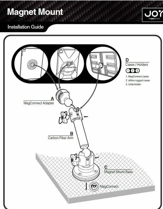 MagConnect ™ mounts zijn gebouwd van hoogwaardige koolstofvezel armen. Carbonfiber is een zeer lichte en sterke koolstofvezel, die vooral toegepast wordt op sportauto’s en -motorfietsen. Dit geavanceerde materiaal is verrassend lichtgewicht maar toch ongelooflijk sterk. De krachtige combinatie van koolstofvezel met zorgvuldig ontworpen gewrichten resulteert in mounts die zowel gemakkelijk te manoeuvreren en stevig in het gebruik.