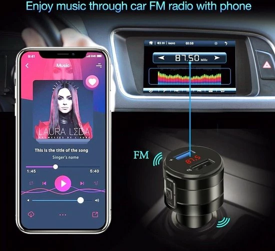 Met Universele FM transmitter Bluetooth kunt u muziek streamen via bluetooth naar uw FM radio. Deze autolader heeft 2 oplaad poorten waarmee u gemakkelijk en snel uw apparaten kunt opladen. U kunt uw smartphone eenvoudig via bluetooth verbinden met deze transmitter, vervolgens zoekt u het aangegeven FM kanaal op en u bent klaar om te gaan! U kunt zelf een FM kanaal kiezen tussen de 87.5 – 108.0 MHz