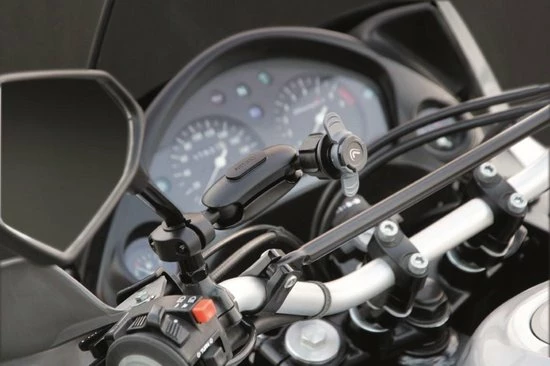 De nieuwe Lampa Titan-serie Opti Bar, spiegel en crossbarbevestiging 9-18 mm diameter. Volledig verstelbare verlengarm met dubbele grip op de kogels voor de beste positionering en zichtbaarheid. De verlengarm wordt in positie gefixeerd door 2 inbusboutjes aan te draaien. Deze worden afgedekt door rubberen dopjes.